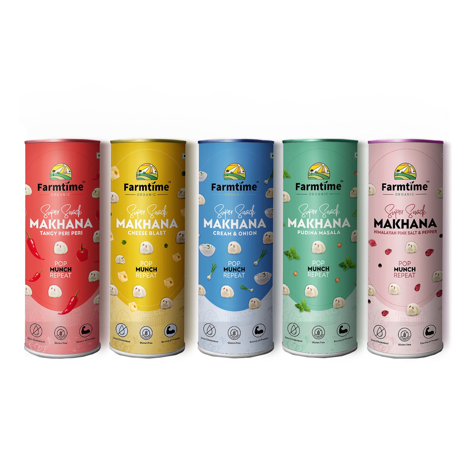Why choose one when you can have all? This 5-pack brings you every Farmtime flavour — Pudina Masala, Tangy Peri Peri, Cheese Blast, Cream & Onion, and Himalayan Pink Salt. The ultimate guilt-free snacking box, perfect for gifting, family get-togethers, or sharing with friends.